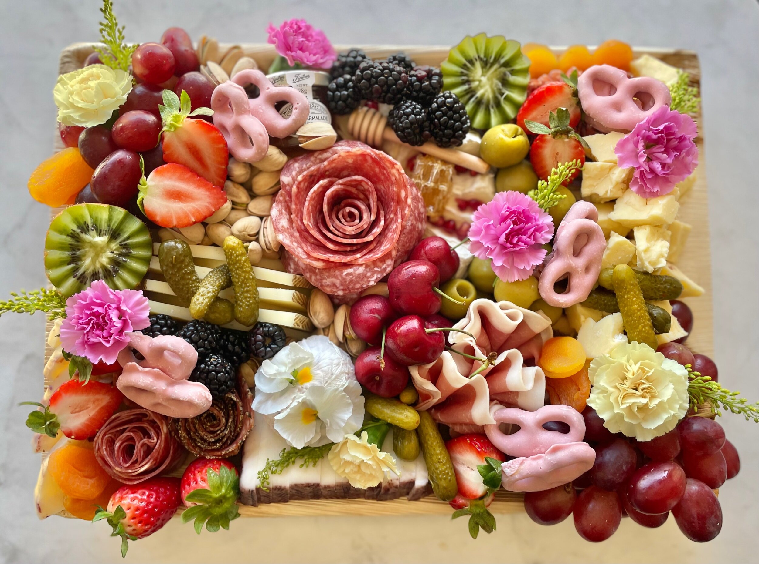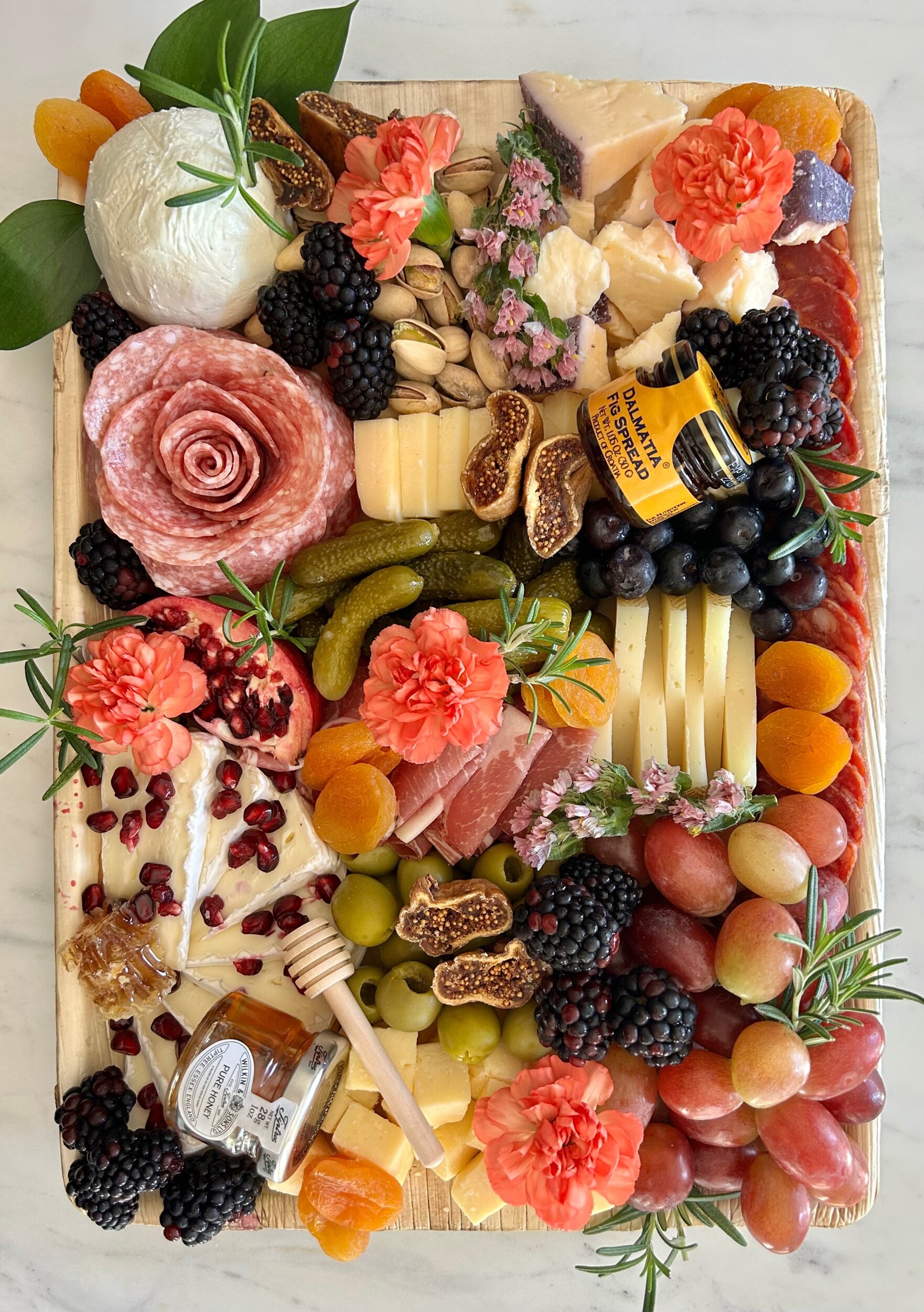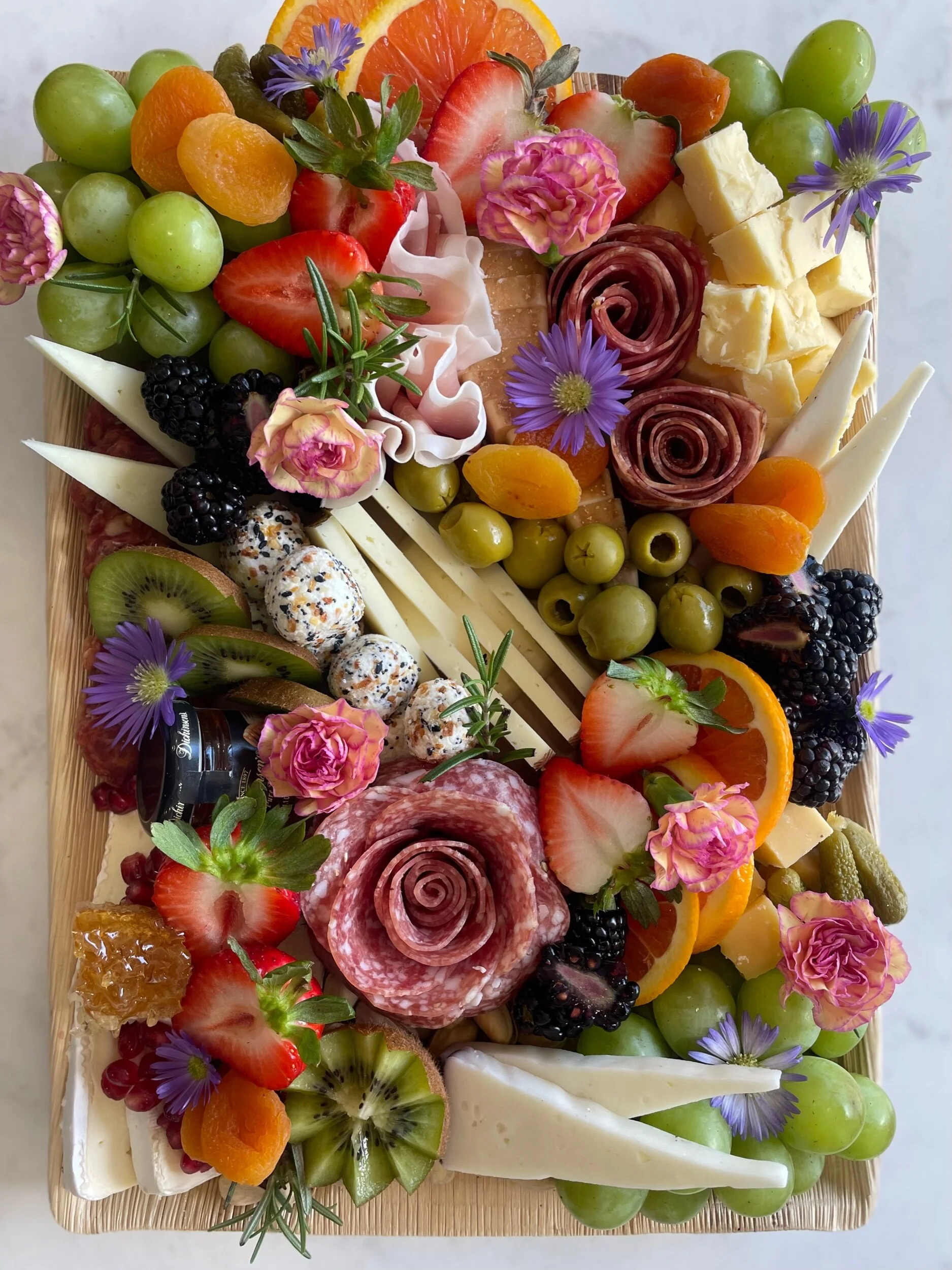 Our Signature Charcuterie & Cheese board serves 8-10 people as an appetizer, featuring a seasonal collection of cured meats, artisan cheeses, fruit, nuts, honey, and accompaniments with crackers on the side.
